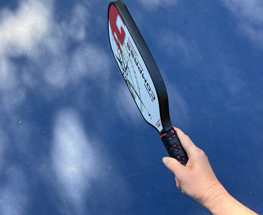 Paddle hold: Use a continental grip (a basic handshake grip) with your hand not too high on the handle. Alternatively, you can use the “V” version of this grip, where your pointer finger points up on the back face of your paddle. Your opposite hand should be placed on the back of the paddle, not wrapped around the grip or on the top of the paddle. This position prepares you quickly for the next ball coming your way.